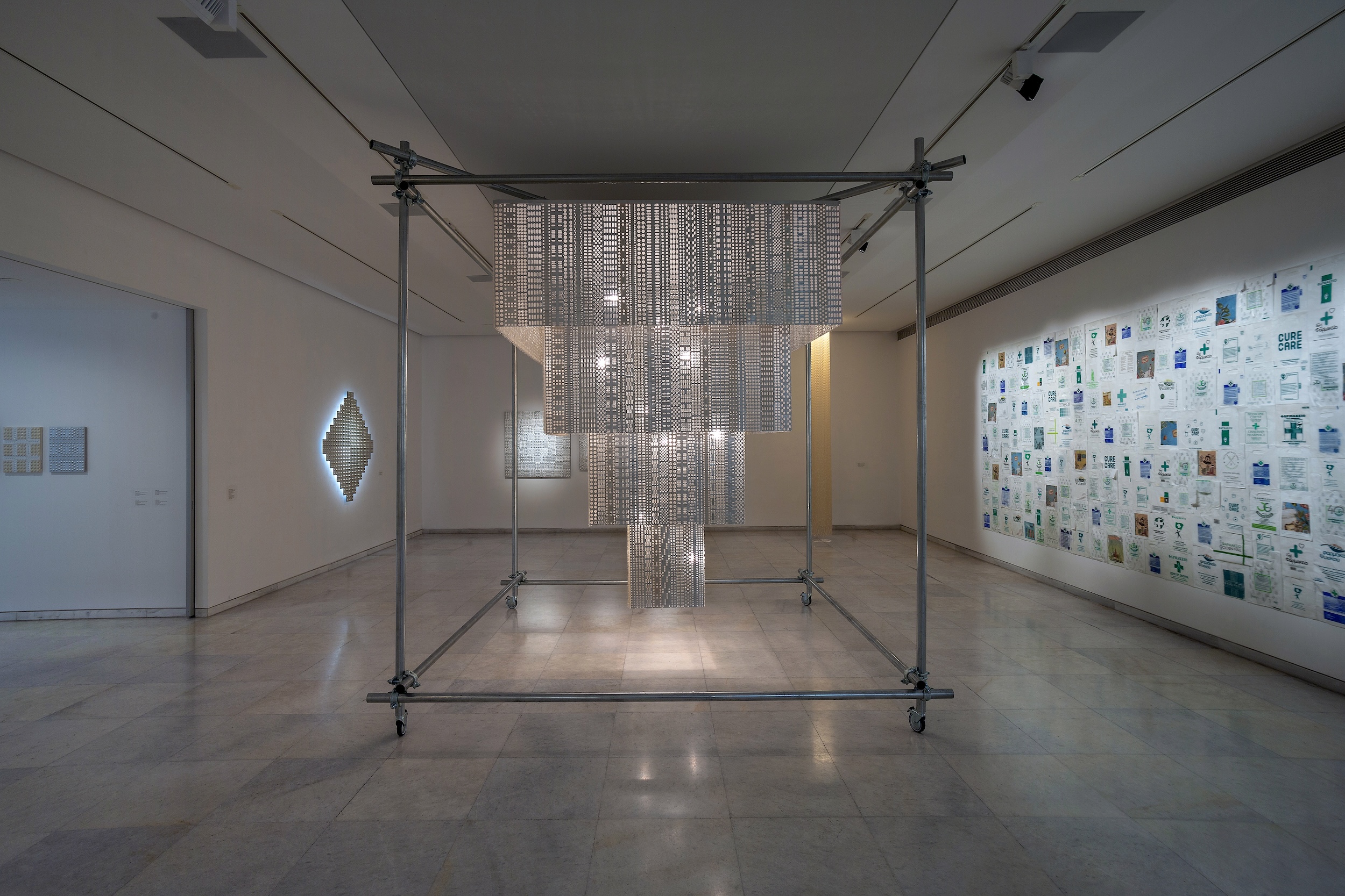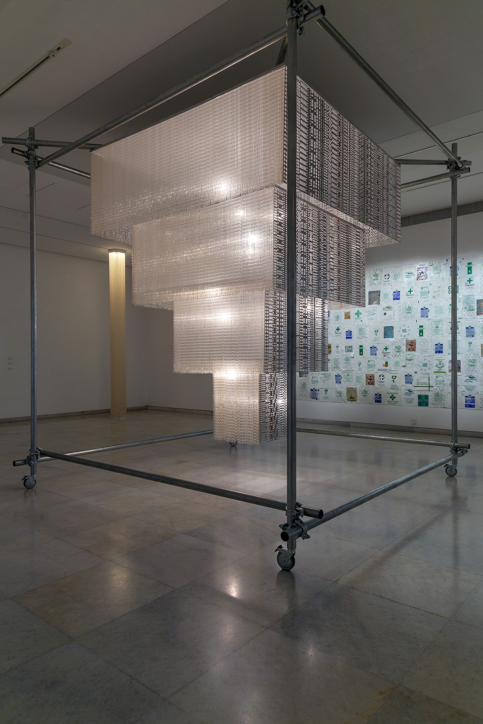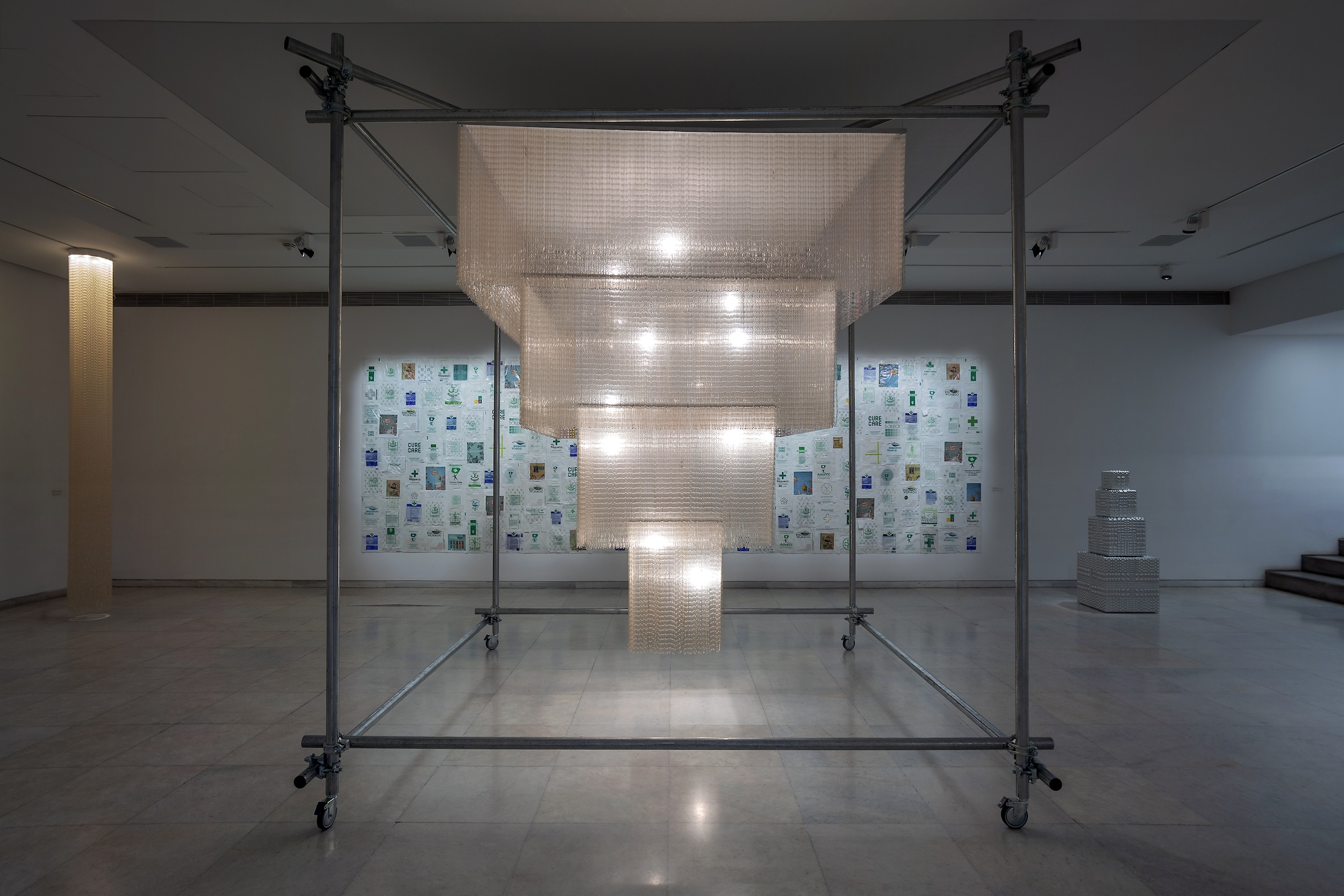 Armour or Migraine Killer Dress – Homage to Andy Warhol, 2021 • Άδειες συσκευασίες χαπιών για την ημικρανία (blisters) και παυσίπονα χάπια, φύλλο αλουμινίου, plexiglass, μεταλλικές βίδες, 176 x 69 x 2,5 εκ.